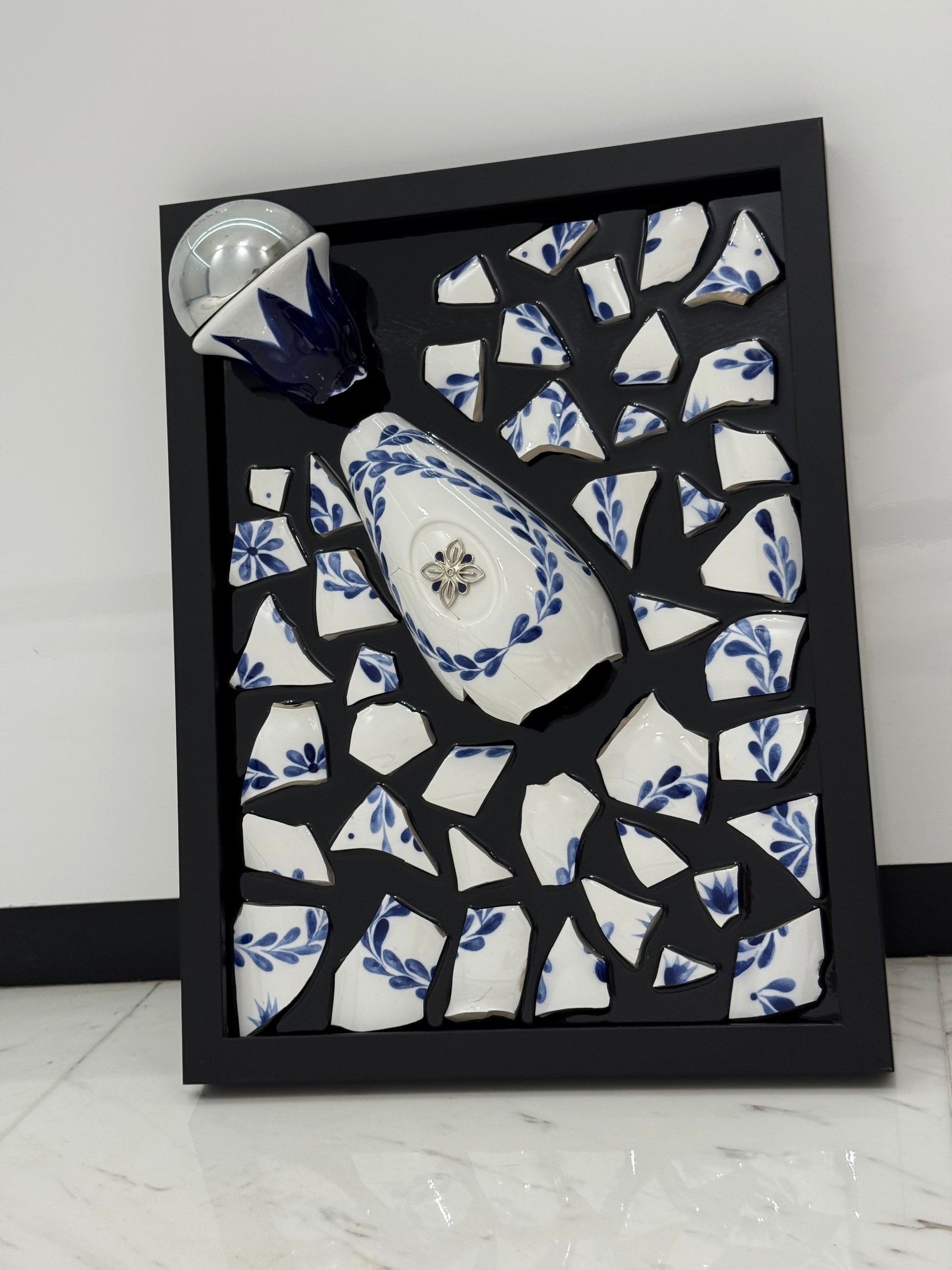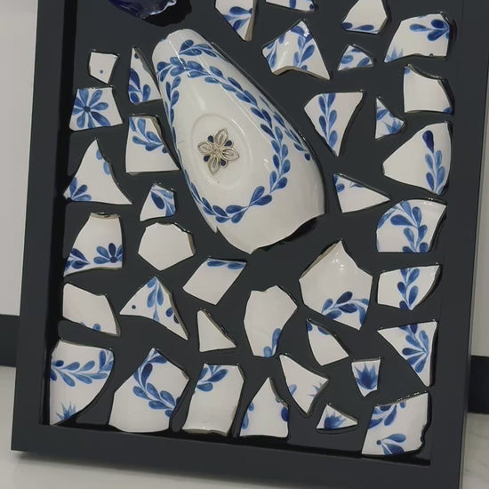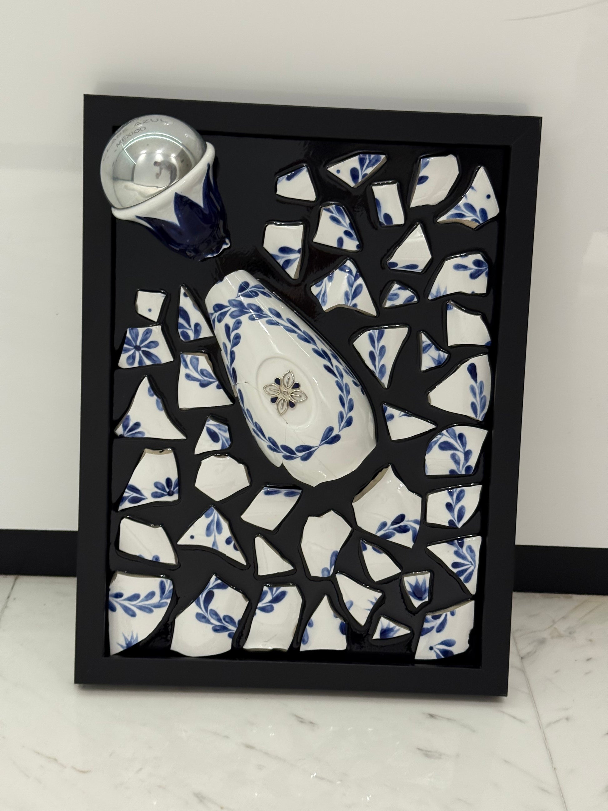 Raw luxury meets bold artistic expression. This handcrafted Clase Azul broken bottle frame transforms shattered porcelain into a powerful statement piece, celebrating the beauty of imperfection and exclusivity. Set within a deep black box frame, the iconic blue-and-white ceramic fragments are carefully arranged to create a striking contrast that instantly commands attention and elevates any space.