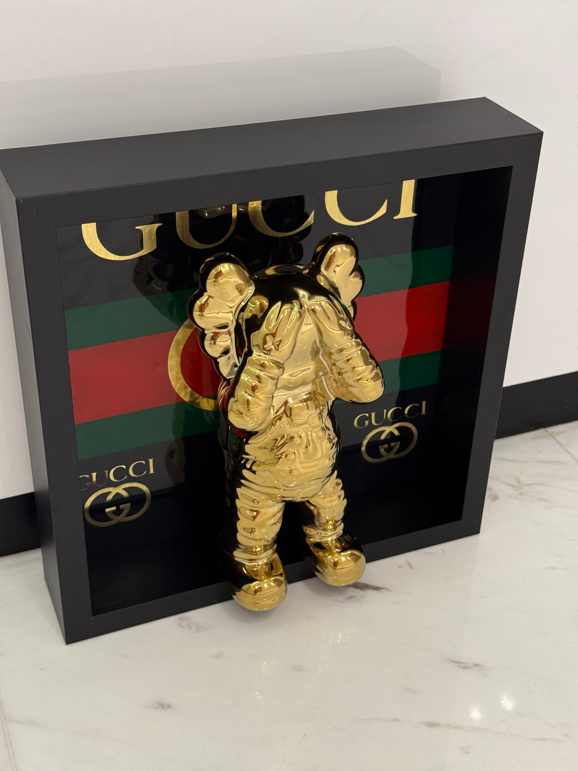 Elevate your interior with the Gold Astronaut in a Gucci Frame, a bold fusion of luxury fashion and modern art. Featuring a striking gold astronaut figure mounted inside a glossy Gucci-branded backdrop, this statement piece transforms any wall or shelf into a gallery of high-end sophistication.ok