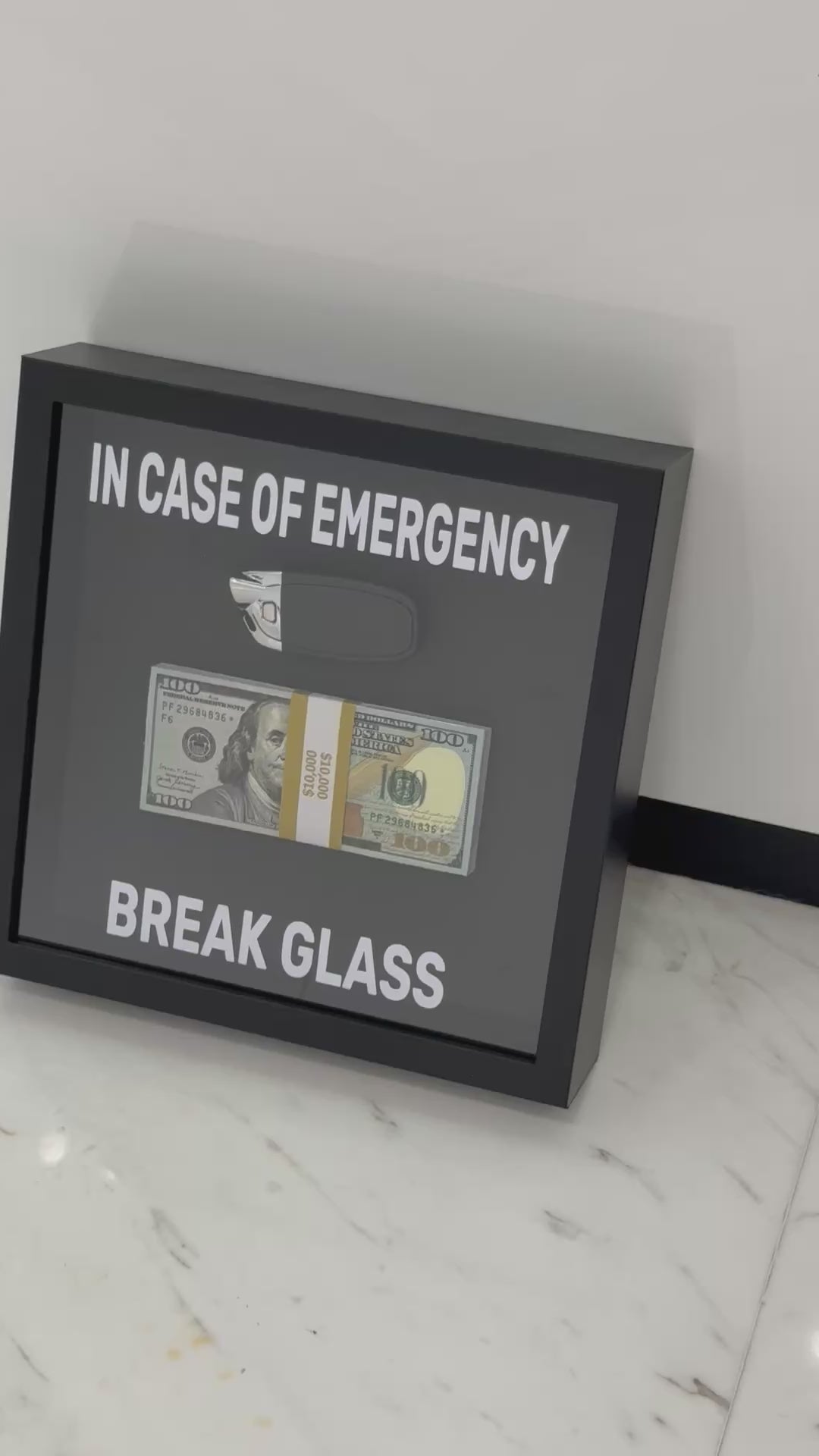 Step into the fast lane of luxury with our In Case of Emergency Frame, featuring the ultimate symbols of success: a Lamborghini key and a stack of money, sealed within a sleek black box frame. Finished with the bold inscription “In Case of Emergency”, this piece merges humor, ambition, and opulence into one unforgettable work of art. It’s not just décor — it’s a lifestyle statement.
