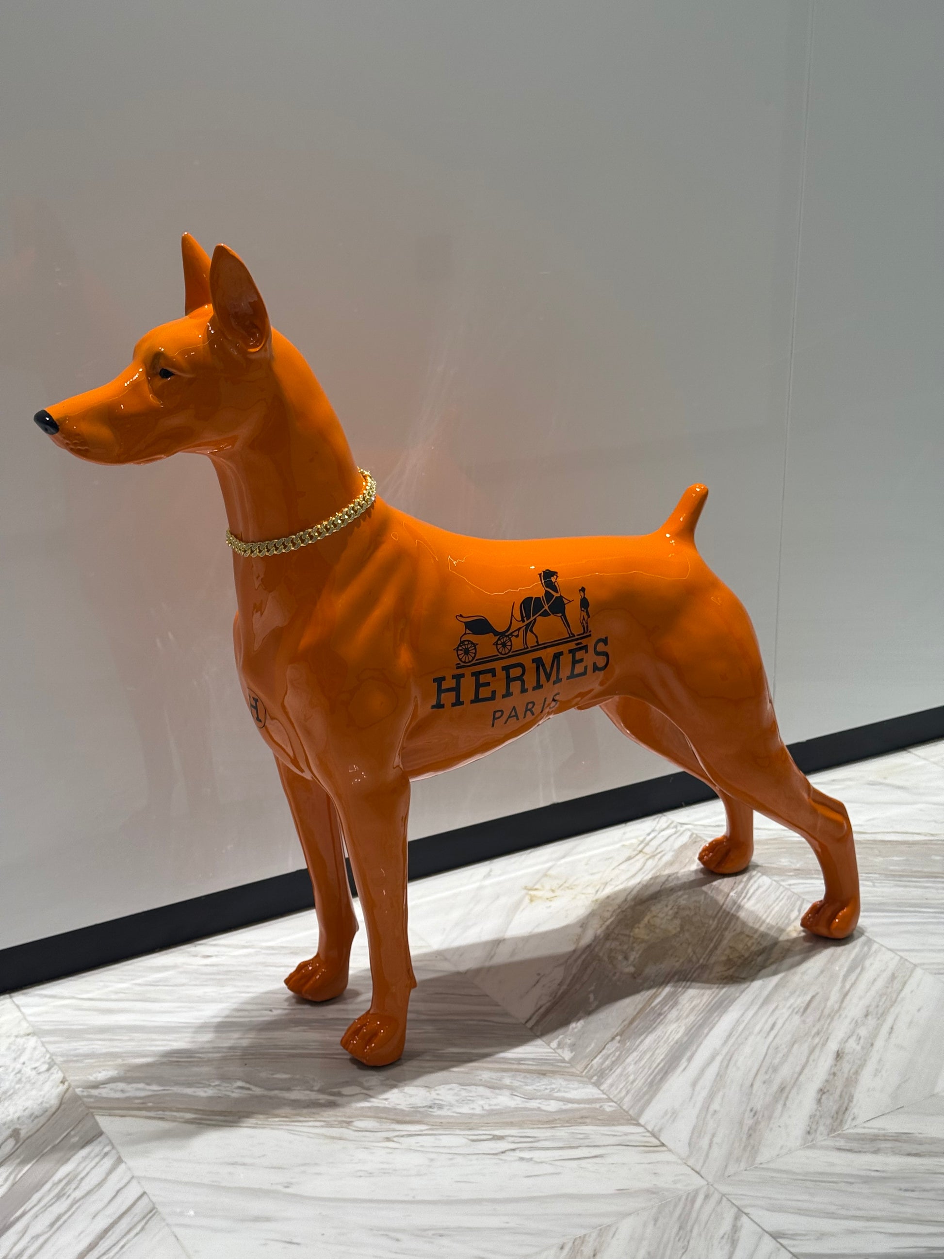 Luxury Orange Hermes Dog Sculpture with Designer Accents